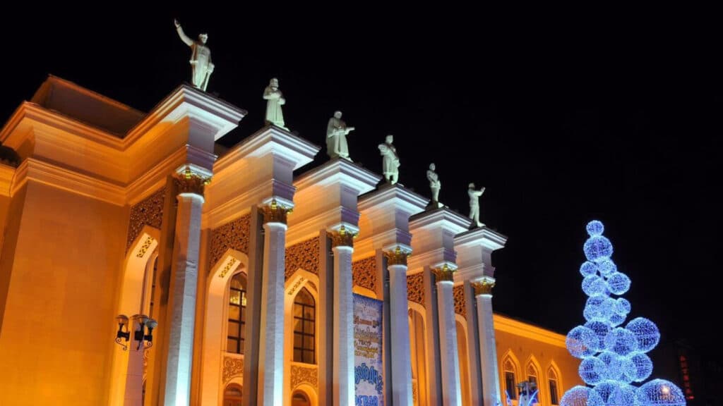 Tour guide Svetlana Dzen, the video’s creator, said construction of the palace lasted 12 years and was completed in 1952. Six figures were installed on the ceremonial portico: a miner, a shepherd, a soldier, an engineer, a collective farmer holding a sheaf and an akyn, or traditional singer, with a dombra.