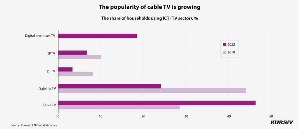 Two years ago, market experts predicted that IPTV would replace the traditional format. However, according to official statistics, the share of households consuming TV services based on IPTV has decreased over the past five years. In 2018, the share of households consuming TV based on IPTV was 10.4% and 6.5% as of the end of last year. On the other hand, the popularity of cable television grew from 28.6% in 2018 to 46.3% in 2022.
