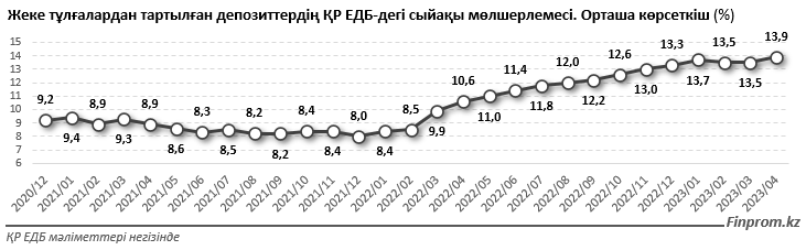 Биыл сәуірде жеке тұлғалар депозиттерінің орташа сыйақы мөлшерлемесі рекордтық 13,9%-ға жетті. Бір жыл бұрын бұл көрсеткіш 10,6% болса, 2021 жылдың аяғында ол небәрі 8%-ды құраған, деп жазады finprom.kz.