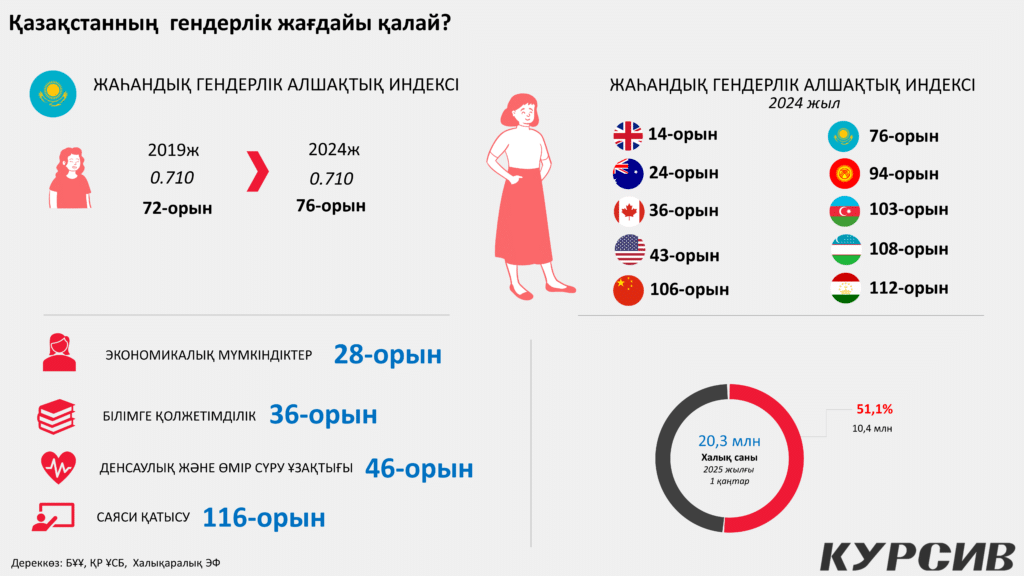 Жаһандық гендерлік алшақтық индексінің 2024 жылға арналған есебі бойынша Қазақстан 76-орында орналасқан, оның жалпы индексі 0.710-ды құрайды. Өткен жылмен салыстырғанда (2023 жылы 62-орын, индекс – 0.721) елдің көрсеткіші төмендеген. Қазақстанның әртүрлі салалардағы гендерлік теңдігіне қатысты негізгі көрсеткіштері төрт негізгі санатқа бөлінеді. Олар: экономикалық қатысу және мүмкіндіктер, білімге қолжетімділік, денсаулық және өмір сүру ұзақтығы, сондай-ақ саяси қатысу.