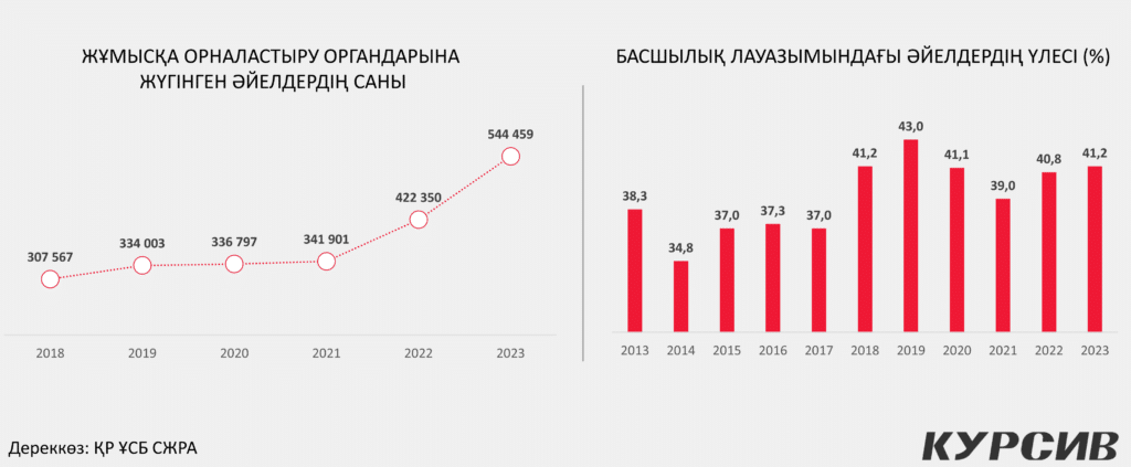 Жұмысқа орналастыру органдарына жүгінген әйелдердің саны айтарлықтай өсіп келеді. 2018 жылы 307 мың әйел өтініш қалдырса, 2023 жылы 544 мың әйел жұмыс тауып беруін өтінген.