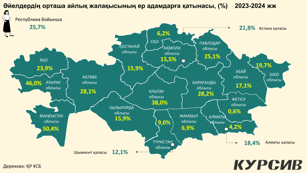 Статистика бюросының мәліметінше, Атырау, Маңғыстау, Ұлытау, ШҚО және Алматы қаласында әйелдердің орташа жалақысы 300 мыңнан асады. Ең көп бас қала – Астанада қаласының әйелдерінің орташа жалақысы 423 мыңға жетіп отыр. Ал қалған өңірлер республикалық көрсеткіштен төмен болып отыр. 2024 жылдың І тоқсанында республика бойынша әйелдердің орташа жалақысы -311 217 теңге.