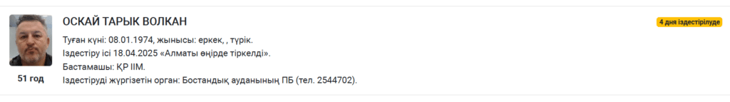Полиция NEF Qazaqstan компаниясының серіктесі Тарык Оскайға іздеу жариялады