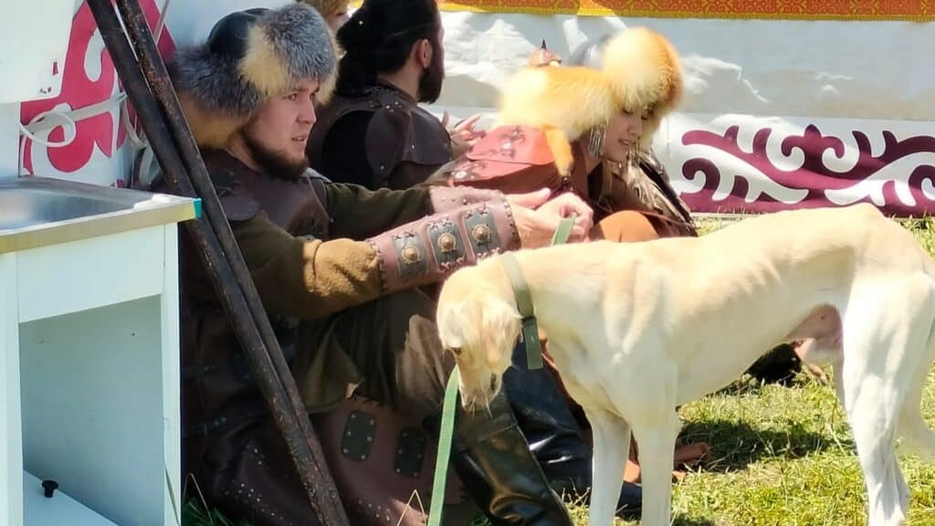 Қарқарадағы қымызмұрындық шарасында құмай тазы мен бүркіті бар, батырлардың образын сомдағын еңсегей бойлы қазақ жігіттері мен жауынгер қазақ арулары ерекше көзге түсті. Бір сәттік үзіліс жасап, дем алып отырған сәті.
