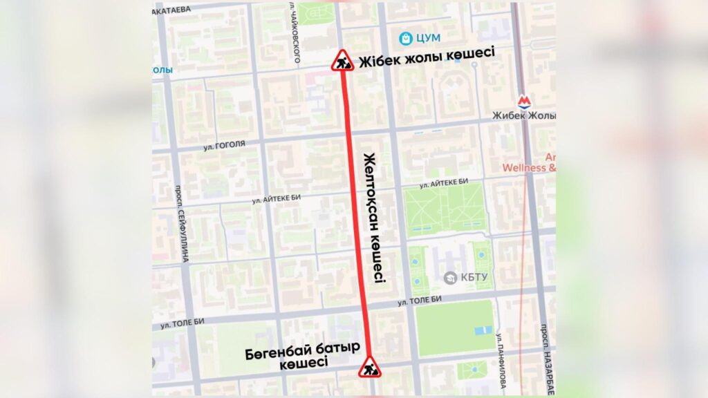 27 маусым күні сағат 08:00-ден 22:00-ге дейін Бөгенбай батыр көшесі мен Жібек Жолы көшесінің аралығы көлік қозғалысына жабылады. Уақытша шектеу құрылыс-монтаждау жұмыстарының жүргізілуіне байланысты енгізіліп отыр.