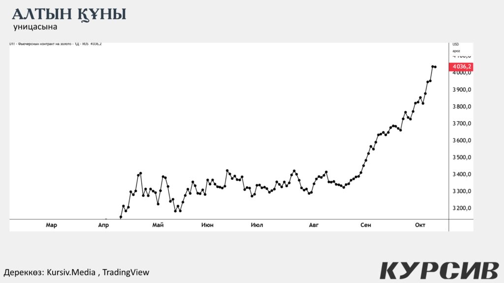 2025 жылдың алғашқы тоғыз айында алтынның құны 53%-ға өсті. Алдыңғы жылдарда мұндай өсім шамамен төрттен бір деңгейінде ғана болған. Бұл күрт серпілістің себебі айқын: жаһандық экономика жоғары құбылмалылық кезеңін бастан өткеріп отыр. Бұған АҚШ-тағы ұзаққа созылған шатдаун, Таяу Шығыстағы қақтығыстар, және Украина маңындағы шиеленіс әсер етті.