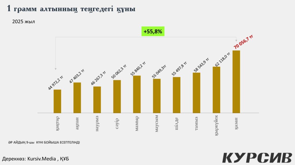 2025 жылы алтынның бағасы ай сайын күрт өсіп, өзінің тарихи рекордын жаңартқан жыл болды. Алтынға сұраныс артқан сайын, оның құны да көтеріле берді. Осы бір жылдың ішінде алтынның 1 грамының бағасы 44,972 теңгеден басталып, 70,056 теңгеге дейін жетті. Бұл өсу тек цифрларда ғана емес, қоғамда да өз әсерін қалдырды.