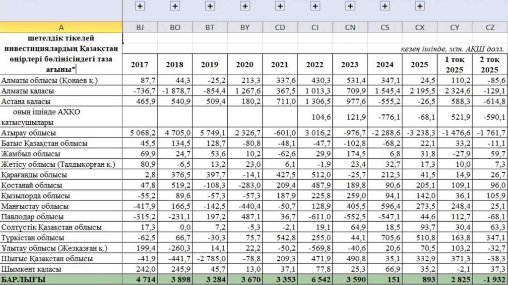 Бұл кестеде Қазақстанның өңірлеріндегі тікелей инвестициялардың таза ағыны көрсетілген. Мұнда санның алдында тұрған «-» (минус) таңбасы өте маңызды экономикалық мағына береді. Таза ағын – өңірге келген инвестициялар көлемі мен сол өңірден кеткен инвестициялар көлемінің айырмасы. Яғни формуласы былай: Таза ағын = келген инвестиция – шыққан инвестиция. Егер санның алдында «–» белгісі тұрса, бұл сол жылы өңірден шыққан инвестициялар келген көлемнен көп болғанын білдіреді.