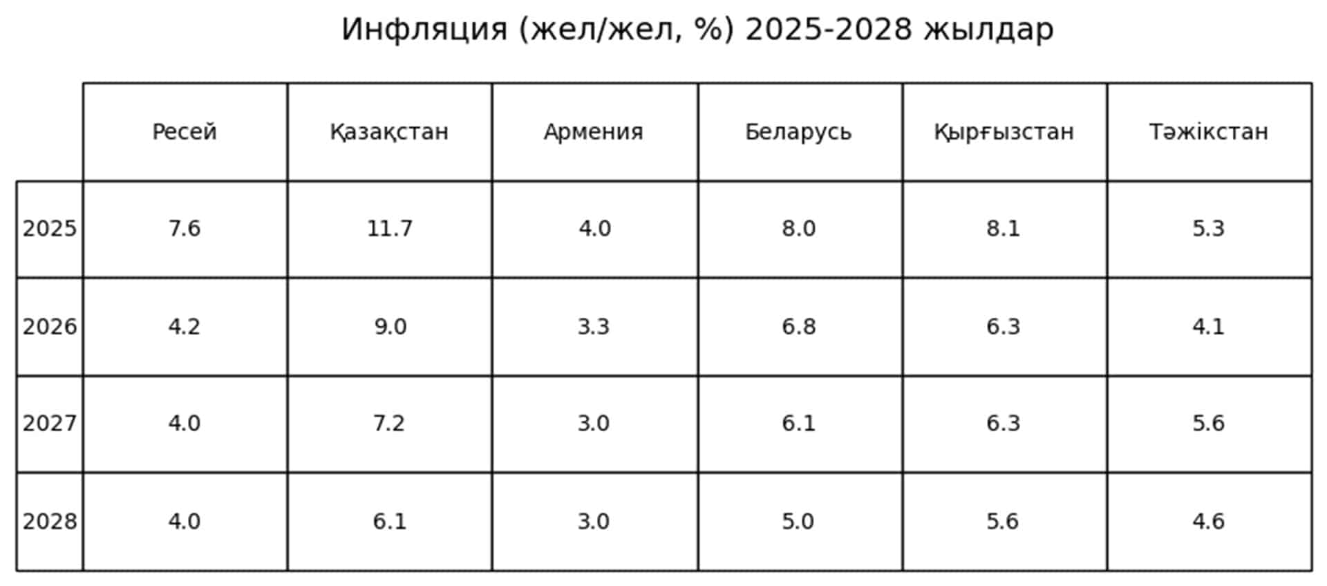 Ұйым жыл аяғы мен жаңа жылдың басында инфляцияның күшейюін қосылған құн салығы (ҚҚС) мөлшерлемесінің ұлғаюымен, теңгенің әлсіреуімен байланыстырып отыр. 2025 жылдың аяғында Қазақстанда инфляция көрсеткіші 11,7% шамасында болады деп болжанды. Ал одан кейінгі жылдары ол біршама түседі, бірақ сонда да Еуразия экономика одағына (ЕАЭО) мүше басқа да елдерге қарағанда жоғары болады.