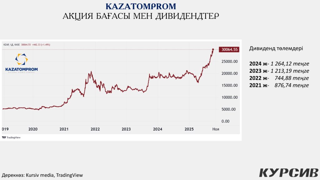 Яғни, екі жылда акция бағасы 134%-ға өсті, бұл Қазақстан нарығындағы ең жоғары көрсеткіштердің бірі. Ал Қазақстан Қор нарығындағы компания бағасы 30 мың теңгеден асты.