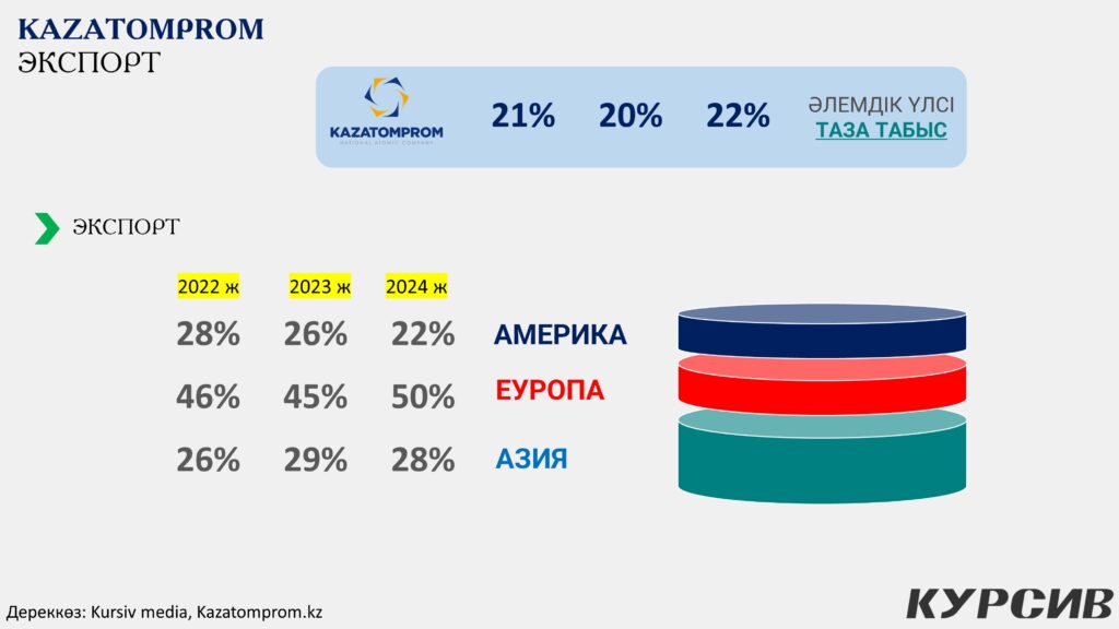 Қазақстан уран экспортындағы жетекші рөлін жыл сайын күшейтіп келеді, ал бұл миссияның басты атқарушысы – «Қазатомөнеркәсіп«. Компанияның өнімдері бүгінде бес құрлыққа тарайды. 2024 жылы уранның басым бөлігі Қытай, Канада, Франция, Оңтүстік Корея және АҚШ нарықтарына жөнелтілді.