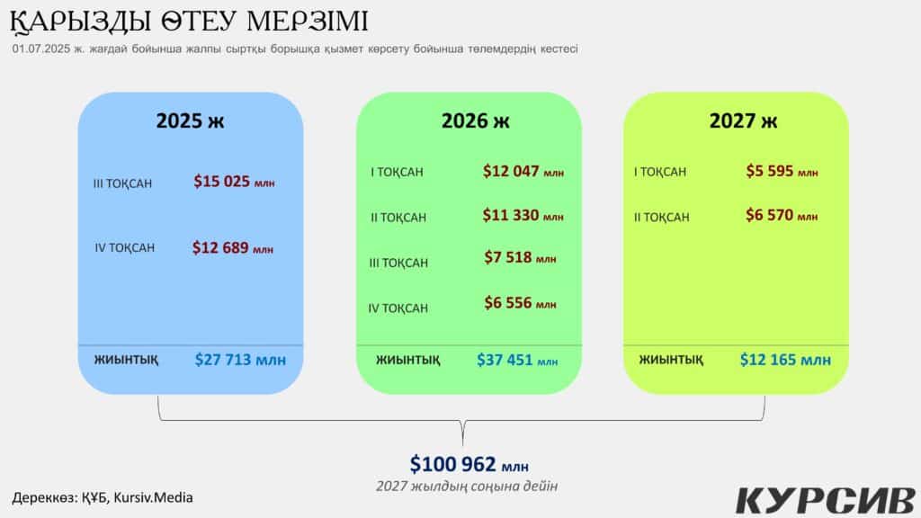 Ұлттық банктің мәліметінше Қазақстанның сыртқы қарызына қызмет көрсету үшін төленетін сома 2025 жылы 27,7 млрд доллар болады деп болжанып отыр. Осы жылдың ішінде ІІІ тоқсанда 15,025 млн, ал IV тоқсанда 12,689 млн доллар төлеу жоспарланған. Бұл көлемдегі төлемдер, әрине, экономикалық қиындықтарға әкелуі мүмкін. Бұл долларға сұранысты арттырып, теңгені құнсыздандыруға  алып келуі ықтимал.
