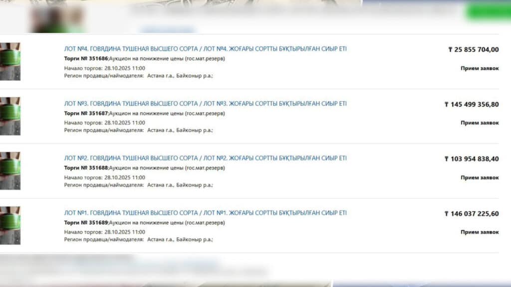 Жалпы құны 450 млн теңгеден асатын өнімдер беске бөлініп аукционға қойылған. Ең қымбат аукционда 146 млн теңгенің консервілері тұр. Әйтсе де, 44370 консерві (бір қорапта 45 данадан) дәл сол сомаға өте қояды дегенді білдірмейді. Аукционда бұл консервілердің ең төменгі бағасы 25,8 млн теңге деп көрсетілген. Саудаға қатысу үшін кемі 5-7 млн теңге кепілдік жарна төлеу керек.