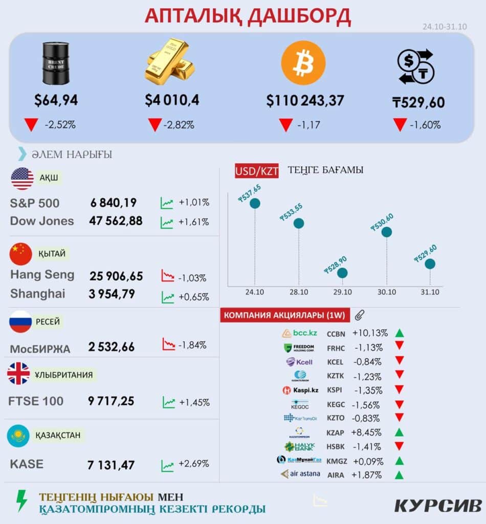 Өткен апта әлем нарықтары үшін әртүрлі бағыттағы қозғалыстармен есте қалды. АҚШ, Қытай және Ұлыбритания биржалары салыстырмалы түрде оң динамика көрсетсе, мұнай мен алтын бағасы төмендеді. Қазақстандық теңге нығайып, KASE индексі 2,69%-ға өсті.