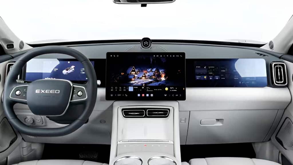 Exlantix ET5 салонында эстетика мен жұмсақтық үйлесім тапқан. Алдыңғы панельде бірден үш экран орналасқан: