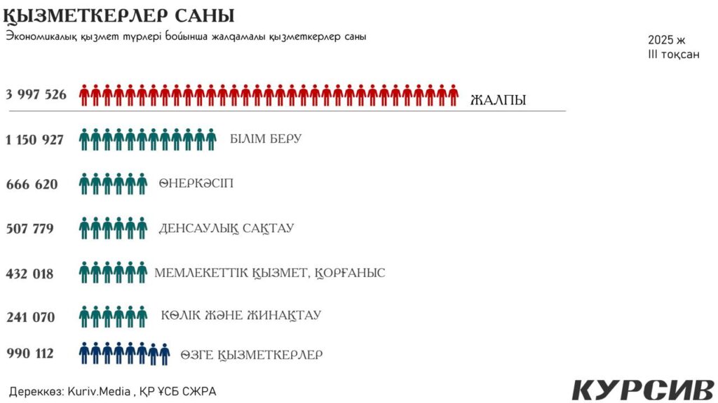 - Мемлекеттік қызмет пен қорғаныста – 432 018 адам,