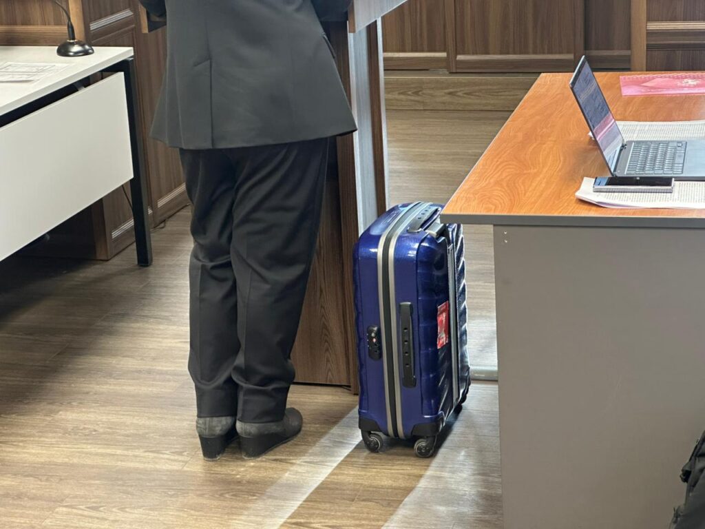 Сот отырысына Альмира Нұрлыбекова көк түсті шабадан ала келген. Айтуынша, чемоданның іске тікелей қатысы бар.