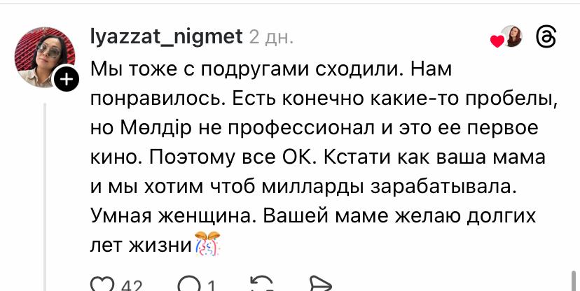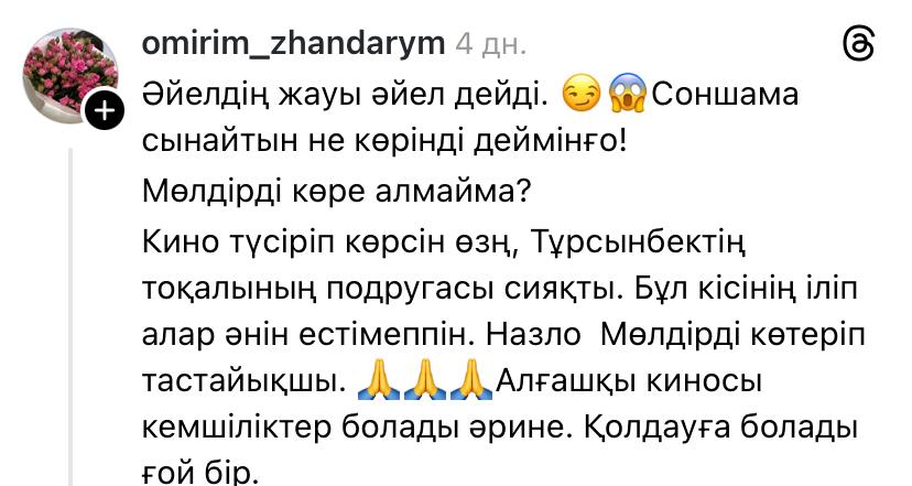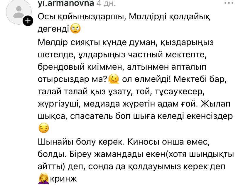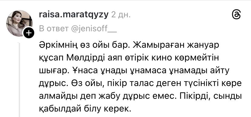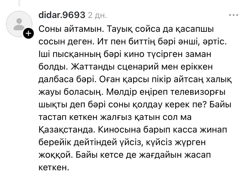 «Отан сөзін бұлай қорлайтындай сіз кімсіз? 3 мың теңгені халықтың қалтасына сіз салып беріп отырсыз ба? Кімді қолдайтынын әр адам өзі шешеді. Халыққа «зарлама» деп қиқулап сөйлеуге құқыңыз жоқ. Әркім киноны да, басқа дүниені де өз пайдасы үшін жасайды. Міндет қылмасын», – деді оқырмандырының бірі.