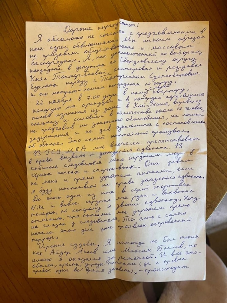 Қадырбек Атамбаев 22 қарашада жазған хатында өзі мен әріптестерінің ешкімді жаппай тәртіпсіздікке шақырмағанын, тек Свердлов сайлау округінде депутаттыққа үміткер Қыял Токторбаеваға қолдау көрсету мақсатында үгіт-насихатпен айналысқанын мәлімдеген.