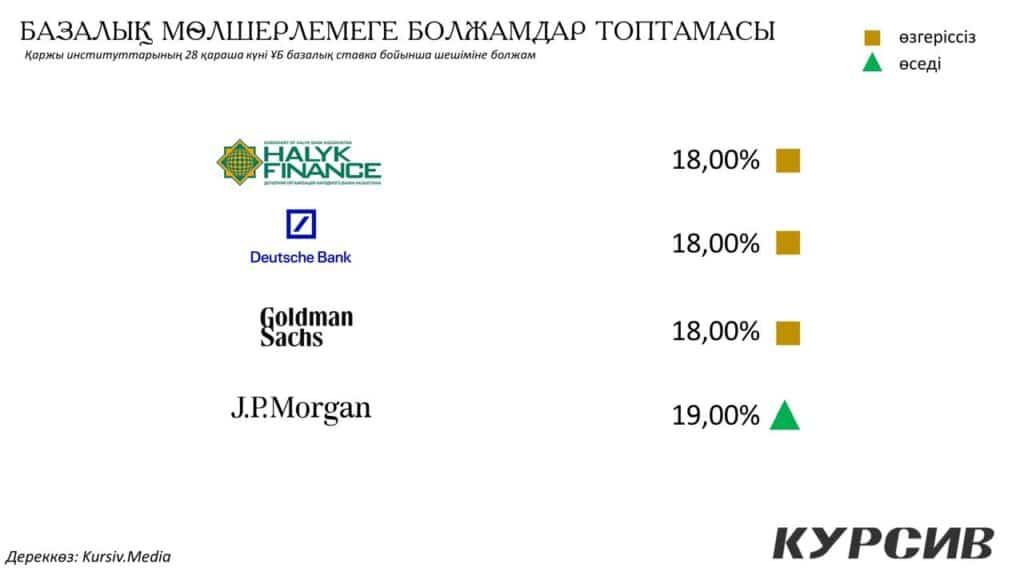 Ал біз беделді қаржы институттарының базалық мөлшерлемеге байланысты болжамын топтастырып, талдап көрейік