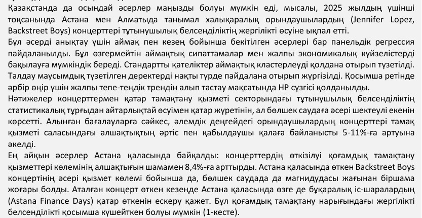 Әлемдік жұлдыздардың концерті өткен қалаларда қоғамдық тамақтану қызметтері көлеміндегі «арақашықтық» 5-11 пайызға дейін өскен. Ең айқын серпіліс Астана қаласында байқалған. Джей Ло мен Backstreet Boys концерті елордадағы сұранысты шамамен 8,4 пайыз көтерген.