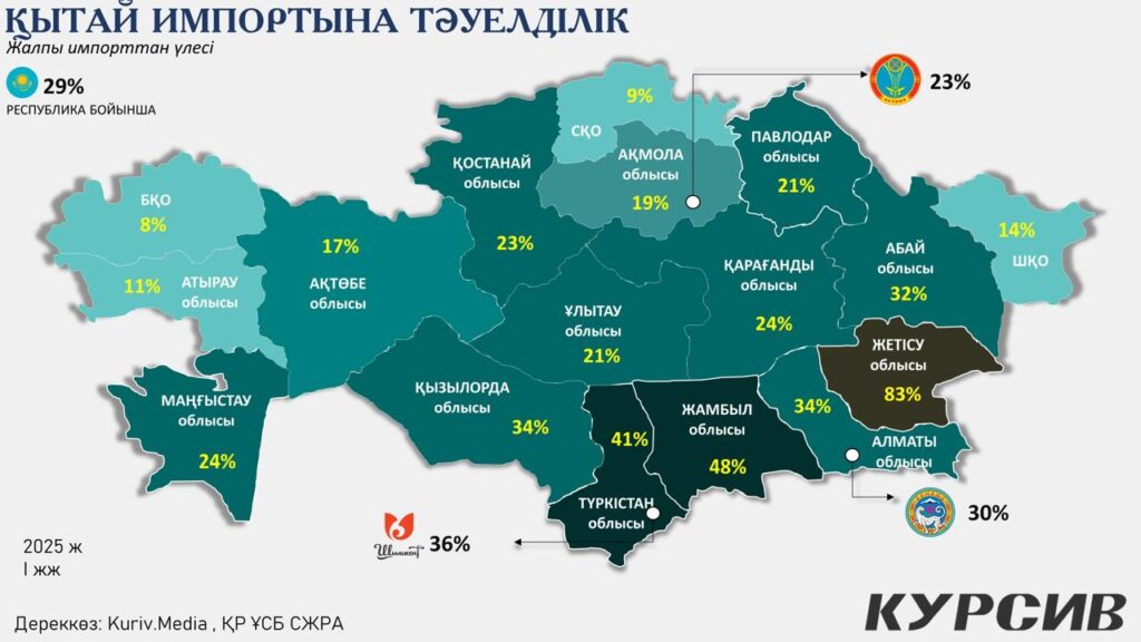 Солтүстік Қазақстан және Батыс Қазақстан облыстары Қытай импортына ең аз тәуелді өңірлер ретінде қалуда — 10%-дан төмен.