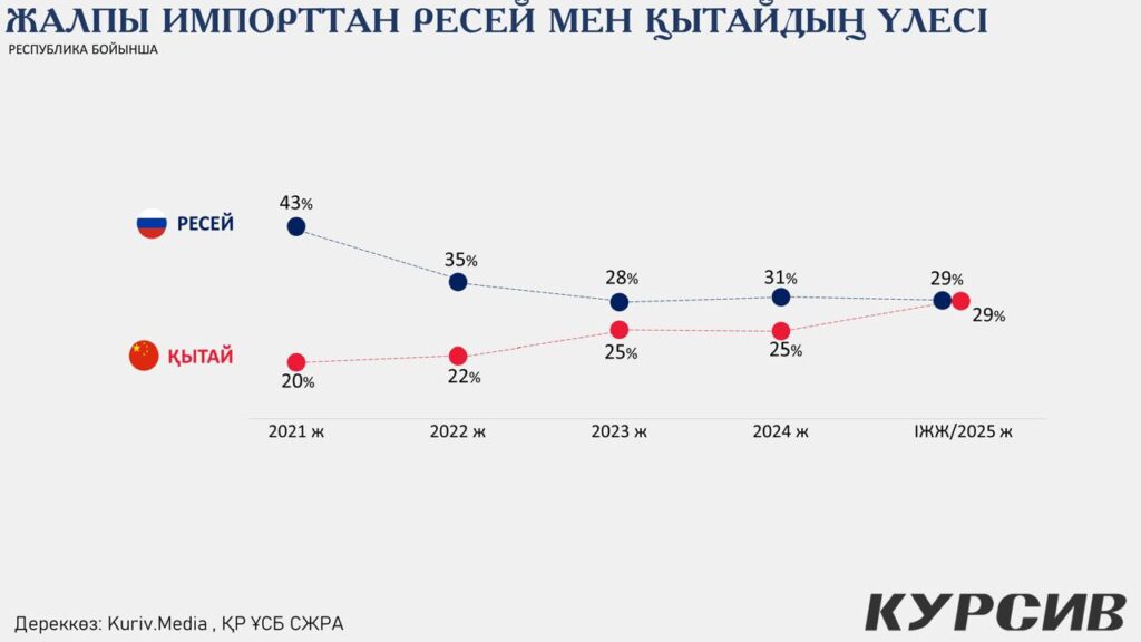 Алайда 2021–2025 жылдар ішінде Ресейдің үлесі үнемі төмендеп, 2025 жылдың алғашқы жартысында 29%-ға дейін түсті.