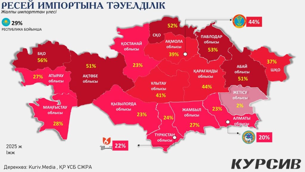 Ал шекара маңындағы өңірлерде жағдай басқаша. Солтүстік Қазақстан, Павлодар, Батыс Қазақстан және Ақтөбе облыстарында Ресейдің үлесі әлі де 50%-дан жоғары, бұл аймақтардың өндірістік ерекшелігі мен логистикалық жақындығымен түсіндіріледі. Тіпті Атырау облысы 2021–2025 жылдары ресейлік тауарлардың үлесін 22%-дан 27%-ға дейін өсірген.