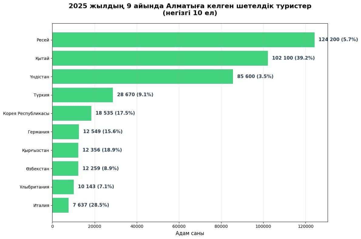 2025 жылғы қаңтар-қыркүйекте шетелден Алматыға келушілер 11%-ға көбейді – 563 мың адам. Олардың дені Ресей, Қытай және Үндістан елдерінен келген. Солтүстіктегі көрші елден 124,2 мың қонақ болды – былтырғыдан 5,7%-ға артық. Ал Қытай туристері бірден шамамен 40%-ға артып, 102,1 мың адамға жетті. Бұл жағынан қытайлықтар Үндістанды басып озды – 85,6 мың (3,5% өсім).