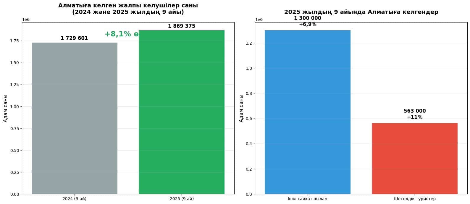 Алматыны көруді асыққан туристер легі жылдан жылға артып келеді. Биыл үш тоқсандағы көрсеткіш 2024 жылғы нәтижемен (1,7 млн) салыстырғанда 8,1%-ға артық.