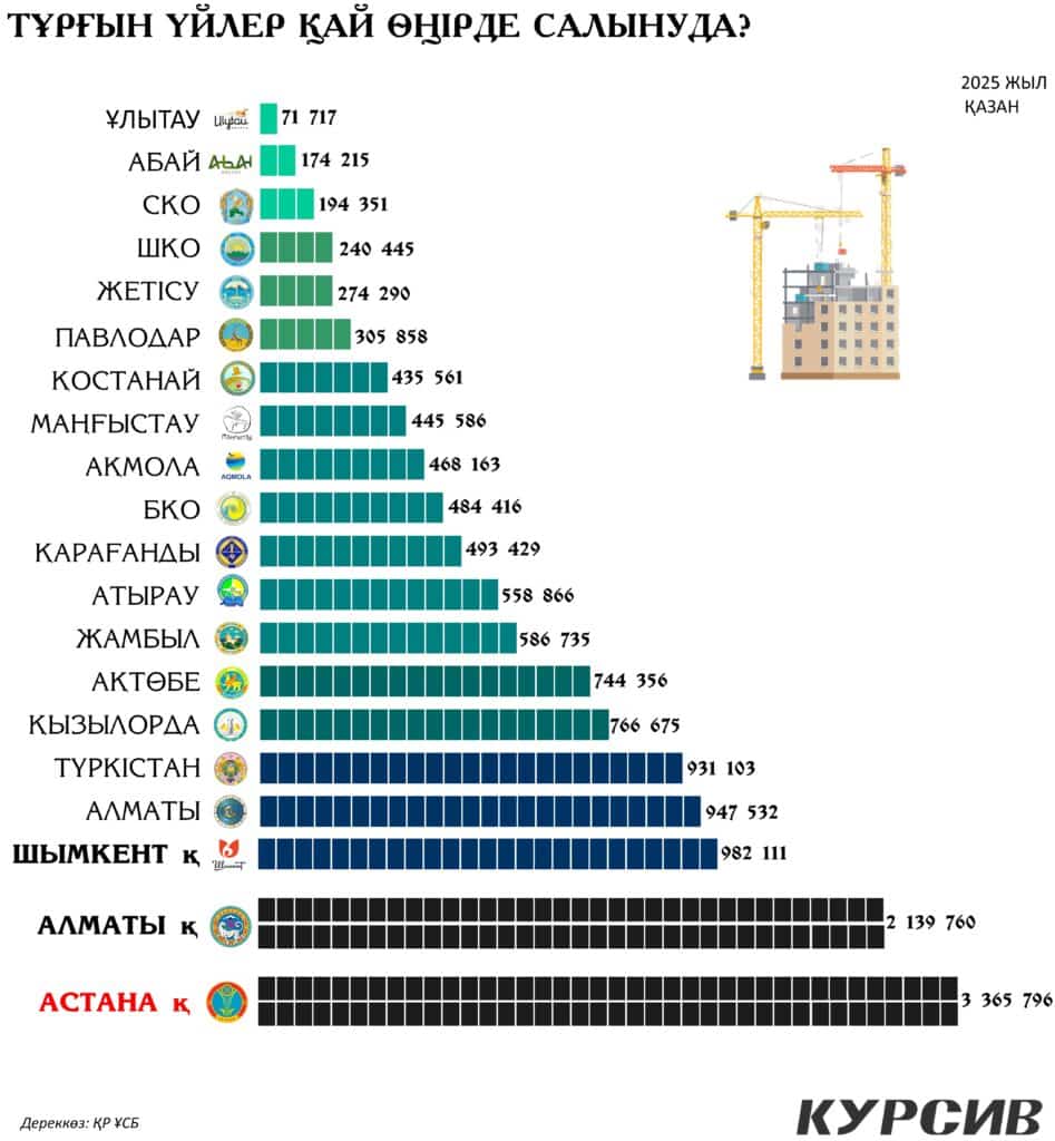 Қазақстандағы тұрғын үйлердің көп бөлігі, әсіресе жаңа үйлер, елдің үлкен қалалары мен экономикалық орталықтарына жақын аймақтарда салынуда. 2025 жылы қазан айында статистика бюросында тіркелген мәліметтер бойынша тұрғын үй құрылысында белсенділік байқалған өңірлер мен қалалар мыналар:
