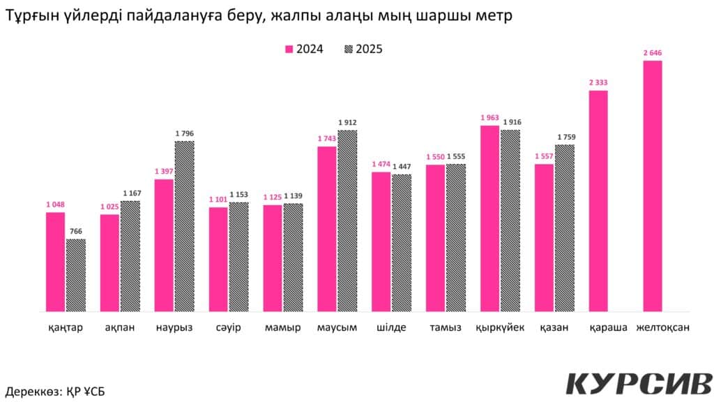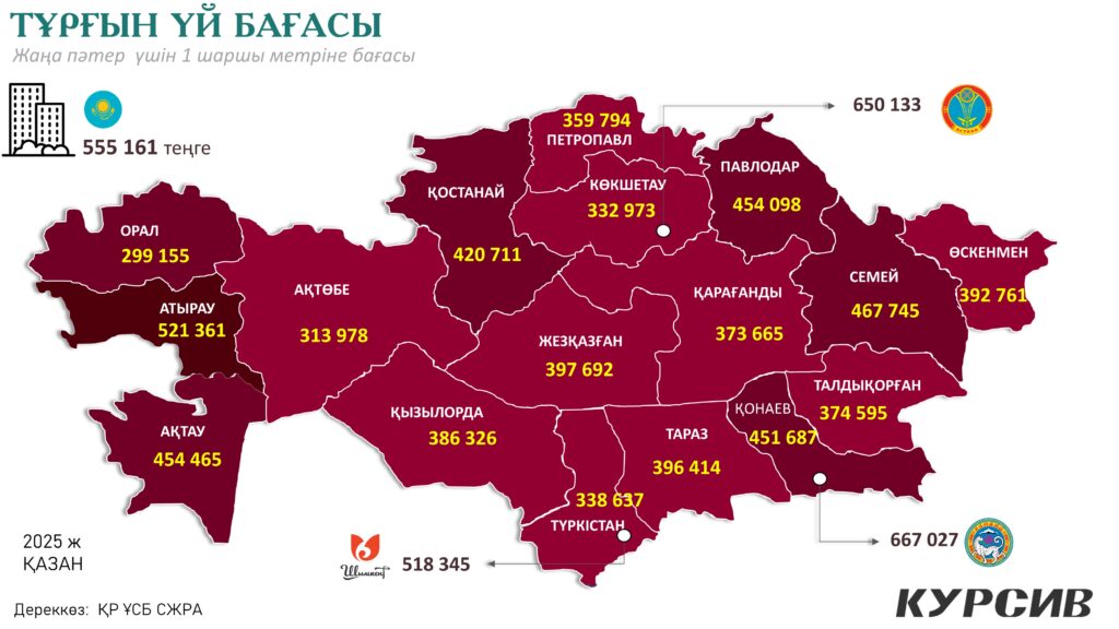 Тұрғын үй нарығының тағы бір маңызды көрсеткіші – баға. 2025 жылдың қазан айында жаңа тұрғын үйлердің бір шаршы метрі 555 161 теңгеге бағаланды, ал қайталама нарықтағы пәтерлердің бағасы 571 828 теңгені құрады. Бұл баға көрсеткіштері өткен жылмен салыстырғанда біршама өскенін байқатады, алайда нарықта сұраныс әлі де жоғары.