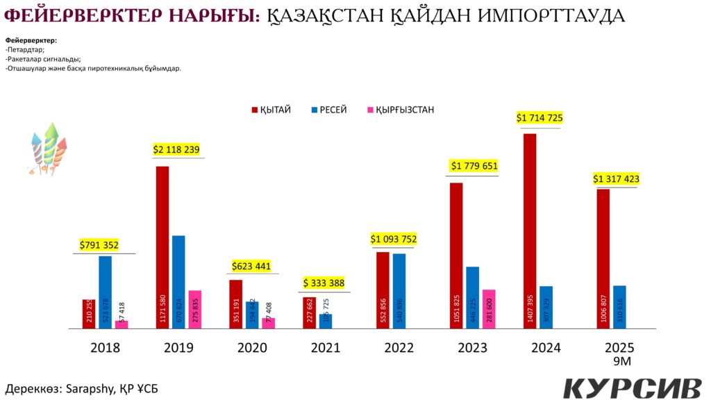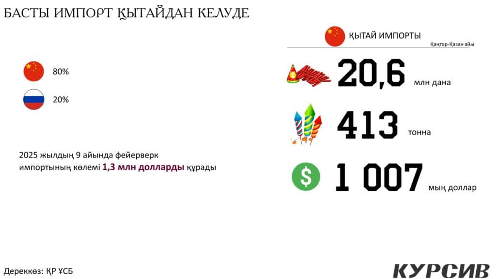 Статистика бюросының мәліметінше 2025 жылдың қаңтарынан қараша айына дейін елімізге Фейервертер (қақпақтар, петарды, фонтан, батарея салюттары, бенгалдық оттар, түсті түтін, жер үсті отшашулар және басқа тұрмыстық пиротехника) 413 тонна импортталды. Бұл тауардың құны 1,3 млн АҚШ долларын құрайды, ал негізгі импорттаушы ел – Қытай. Алайда биыл бұл көрсеткіш 2 млн доллардан асуы мүмкін, себебі жоғарыда айтып кеткеніміздей халық қараша мен желтоқсан айларында отшашу құралдарын жаппай сатып алады.