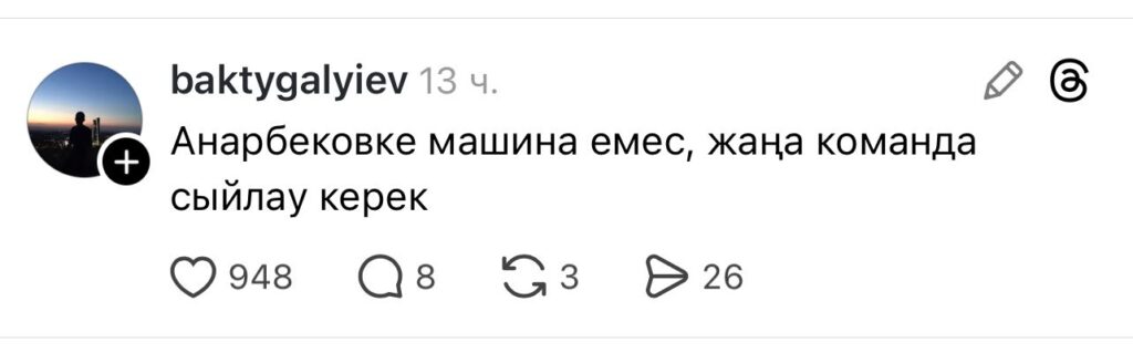 «Анарбековке машина емес, жаңа команда сыйлау керек» десе, тағы бірі: «Бүгінгі ойынның үздігі – Анарбеков пен штанга» деп жазған.