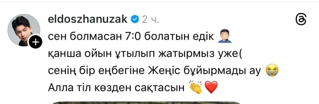 «Сен болмасаң 7:0 болар едік. Саған дұғада жүрміз, Алла тіл-көзден сақтасын» деген жазбалар да таралып жатыр.
