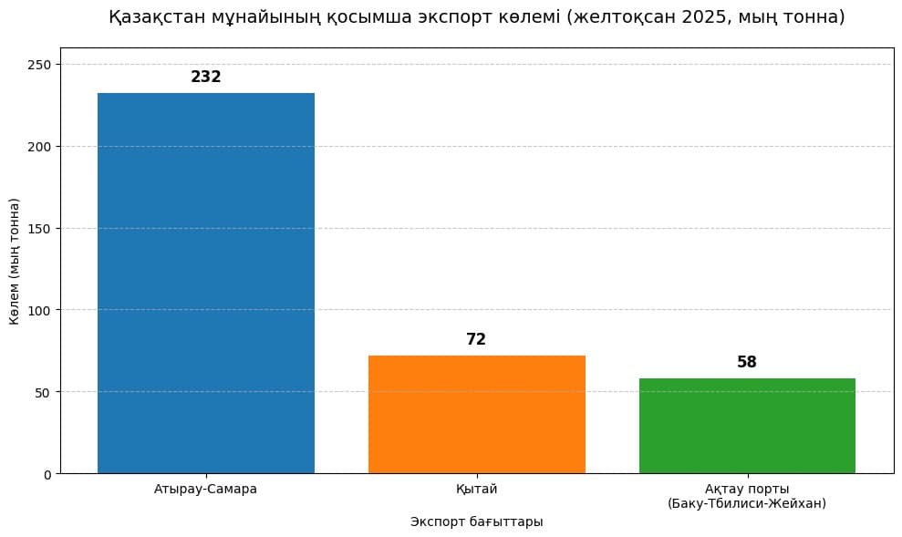 2025 жылғы желтоқсанда, «ҚазТрансОйл» мәліметінше, шикізаттың дені – 232 мың тонна мұнай Самара бағытындағы құбырмен экспортталып жатыр. Атасу – Алашанькоу мұнай құбырымен Қытайға 72 мың тонна мұнай айдалды. Айта кетейік, алғаш рет Қашағанда өндірілген мұнай аспан асты еліне қарай аға бастады. Желтоқсанда Ақтау порты арқылы Баку – Тбилиси – Жейхан бағытында 58 мың тонна мұнай экспортталды.