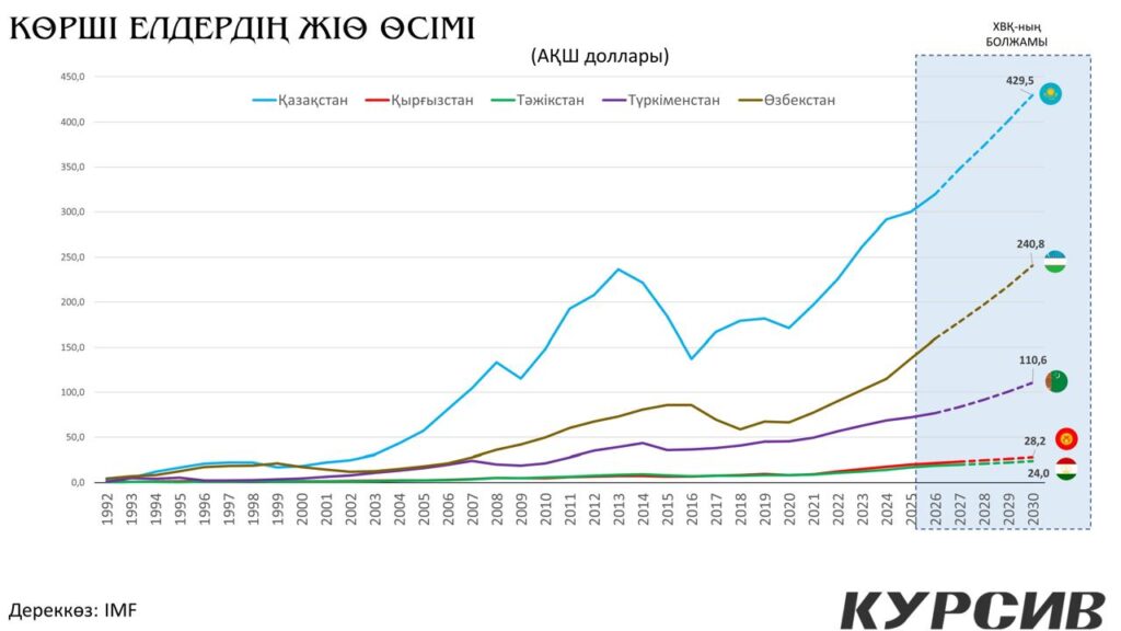 Қазақстанның ЖІӨ динамикасы тек ішкі факторларға ғана емес, сондай-ақ көрші елдермен салыстырғанда да ерекше маңызды. Орталық Азияда Қазақстан – ең ірі экономикаға ие мемлекет. Мысалы, Халықаралық Валюта қорының мәліметінше 2030 жылға қарай Қазақстанның ЖІӨ болжамы 429,5 миллиард АҚШ долларына жетуі мүмкін, ал Өзбекстанда бұл көрсеткіш 240,8 миллиард АҚШ долларын құрауы мүмкін. Тәжікстан мен Қырғызстанда бұл көрсеткіш тиісінше 28,2 және 24,0 миллиард АҚШ долларына жетеді деп күтілуде. Түрікменстан экономикасының болашағы да өседі, бірақ ол Қазақстаннан әлдеқайда төмен болмақ.
