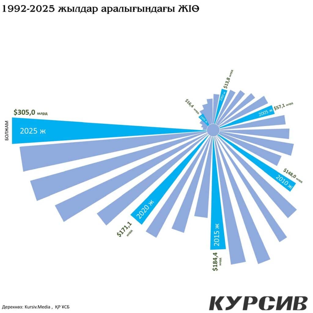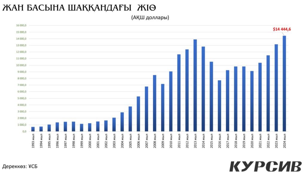 ЖІӨ жан басына шаққанда көрсеткіші де осы кезеңдерде өзгерді. 1991 жылы жан басына шаққандағы ЖІӨ 1000 АҚШ долларынан аспайтын еді. Бірақ 2025 жылға қарай бұл көрсеткіштің 14 444 АҚШ долларына дейін өсуі күтілуде. Бұл динамика Қазақстанның экономикасындағы тұрақты өсу мен даму үрдістерін көрсетеді.