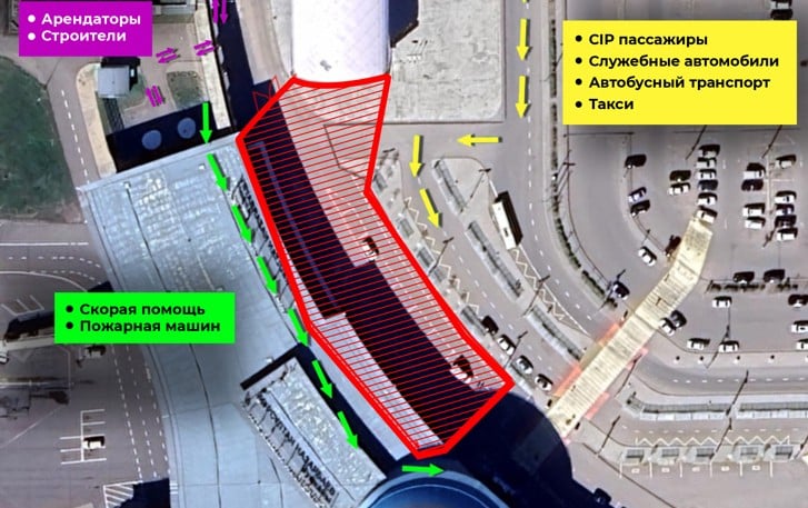 Құрылыс кезінде T2 терминалы аймағында көлік қозғалысының схемасы өзгереді. Жедел жәрдем мен өрт сөндіру қызметінің машиналары терминал шатырының астынан өтеді, CIP санатындағы жолаушылар қоғамдық көлік бағыты бойынша кіре алады. Ал қызметтік көлік, автобустар, таксилер мен жеке автомобильдер қозғалысы құрылыс алаңының қоршауларын ескере отырып ұйымдастырылады.