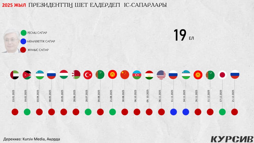2025 жыл Қазақстанның сыртқы саяси күн тәртібі үшін «тыныш» жыл емес. Алайда сандарға қарасақ, бір қызық тенденция байқалады. Президент 2024 жылы 23 мемлекетке барса, 2025 жылы 19 елмен ғана шектелген.