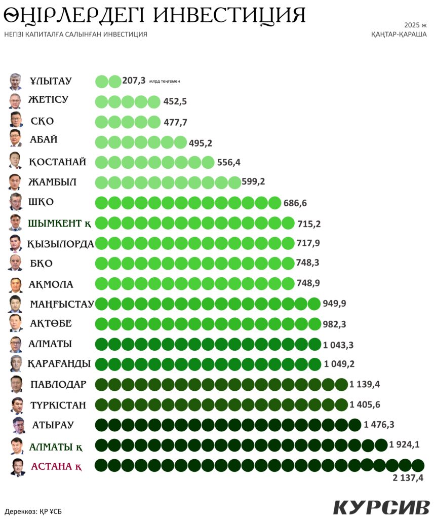 Қазақстанның әр облысы мен қаласы – жеке бір экономика болып саналады. Сондай-ақ әр өңір өз әлеуетін жүзеге асыру үшін күресуде. 2025 жылдың 11 айында ең көп инвестиция тартқан өңір – Астана қаласы. 2 137,4 млрд теңге көлемінде инвестиция құйылып, бұл қаланы еліміздің экономикалық жүрегіне айналдырды. Астана алдағы жылдары да даму үстінде болмақ.
