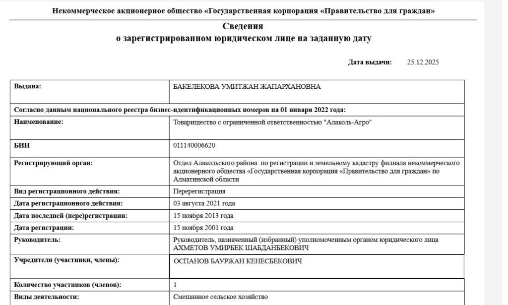 E-gov дерегі бойынша, «Алакөл Агро» компаниясы 2001 жылы құрылып, соңғы рет 2023 жылы қайта тіркеуден өткен. Құрылтайшысы Баукен Алмас Қайратұлы деп көрсетілген. Ал 2022 жылдың наурызына дейін кәсіпкер Бауыржан Кеңесбекұлы Оспановқа тиесілі болған. Kompra дерегі бойынша, оған дейінгі құрылтайшыларының қатарында Кеңесбеков Нұркелді Нұрланұлы мен Уансынов Қанат Болатқанұлы бар.