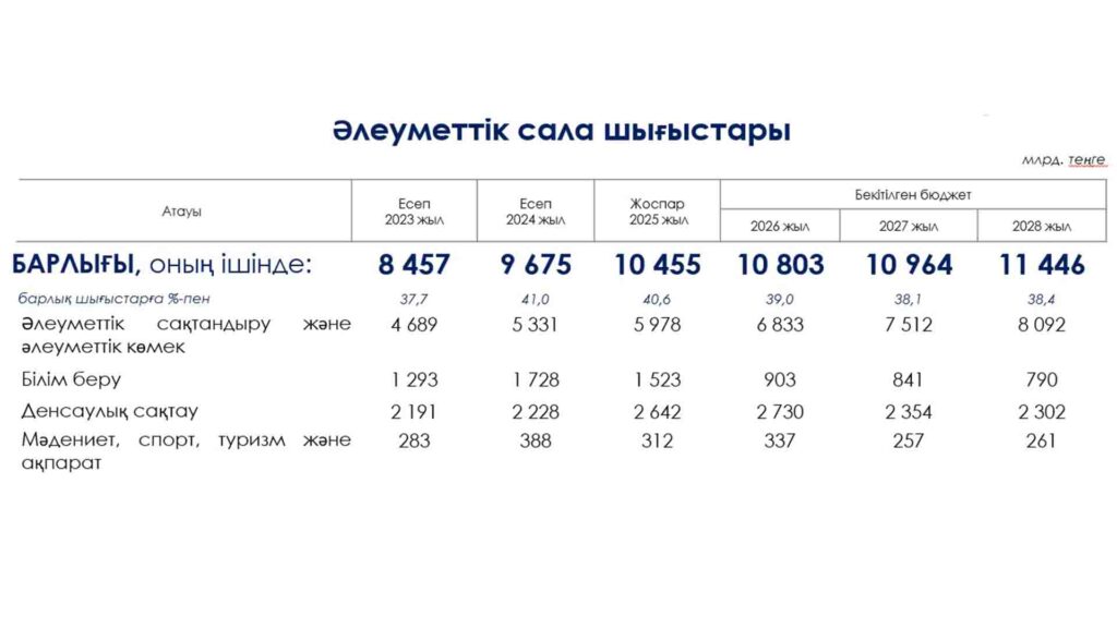 Бұл қаржының 40 пайызы әлеуметтік сақтандыру мен әлеуметтік көмекке жұмсалады. Ал денсаулық сақтау саласына 2026 жылы 2,7 трлн теңге бөлінсе, 2027-2028 жылдары азайып, 2,3 трлн теңгені құрайды.