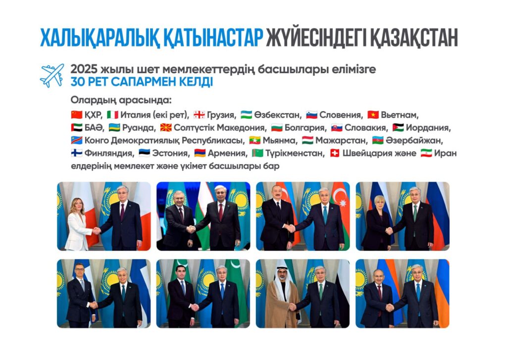 Қазақстан президенті биыл 23 рет шетелге шығып, 30 елдің басшысын республикада қарсы алды. Бұл туралы президент Қасым-Жомарт Тоқаевтың баспасөз хатшысы Руслан Желдібай жазды.