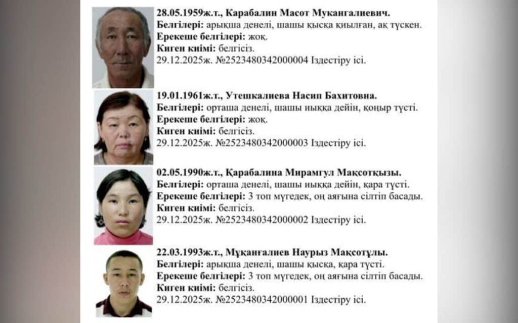 2025 жылы 25 желтоқсанда Атырау облысының тұрғыны бір айдан аса бауыры және оның отбасымен байланыса алмай жатқанын айтып, полицияға арыз түсірген. Қызылқоға ауданы, Жангелді ауылында тұратын отбасы өткен жылдың қарашасында жоғалып кеткен.