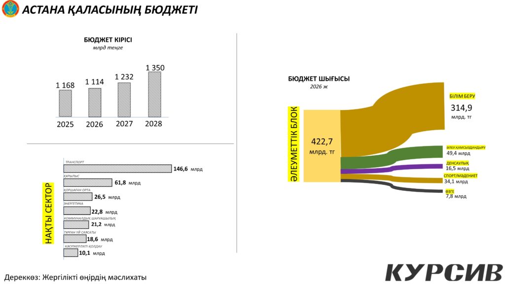 Астана бюджеті көлемі жағынан екінші орында. 2025 жылғы 1,17 трлн теңге 2028 жылға қарай 1,35 трлн теңгеге жетеді. Өсу бар, бірақ Алматымен салыстырғанда анағұрлым баяу. Мұның себебі – Астананың экономикалық құрылымы көбіне әкімшілік, мемлекеттік және инфрақұрылымдық функцияларға тәуелді.