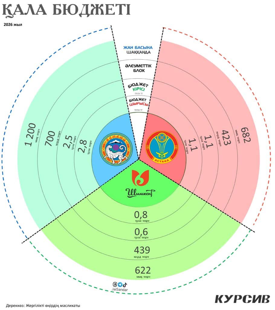 Қазақстанның экономикалық ландшафтында мегаполистердің рөлі жыл сайын артып келеді. Астана, Алматы және Шымкент – тек халық саны мен инвестиция көлемі бойынша ғана емес, бюджеттік архитектурасы, кіріс құрылымы және шығыс басымдықтары арқылы да бір-бірінен айқын ерекшеленеді. 2026–2028 жылдарға арналған бюджет болжамдары мен 2026 жылғы шығыс құрылымына қарасақ, бұл үш қала – Қазақстандағы урбанистік дамудың үш түрлі моделін көрсетіп отыр.