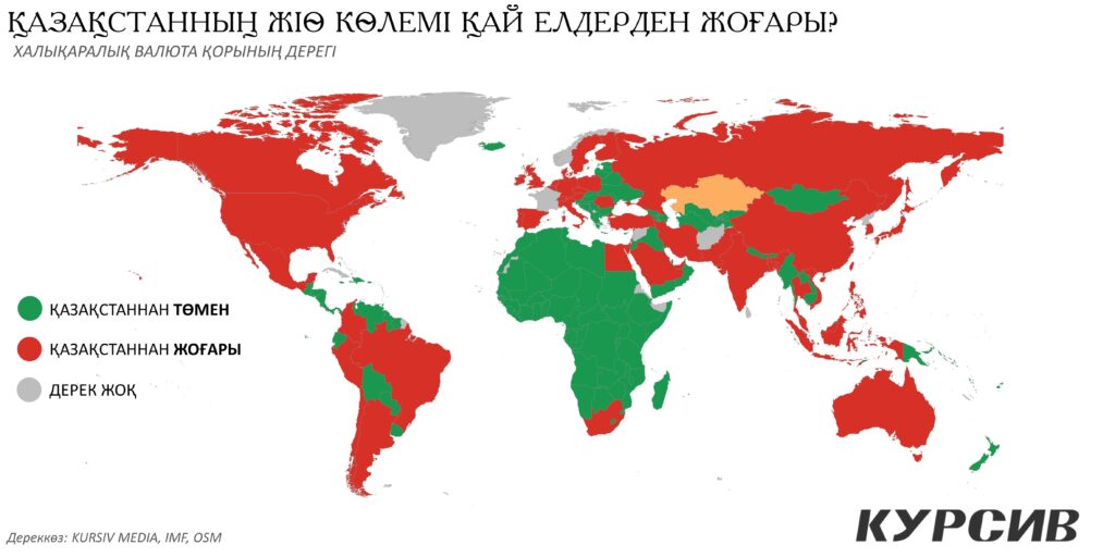 Қазақстанның 2025 жылғы болжамды номинал ЖІӨ көлемі –300 млрд доллар. Бұл көрсеткіш елді әлемде шамамен 55–60 орын аралығына орналастырады. Kursiv Media Халықаралық валюта қоры ұсынған әлем елдерінің болжамды ЖІӨ-і арқылы салыстырып көрейік.