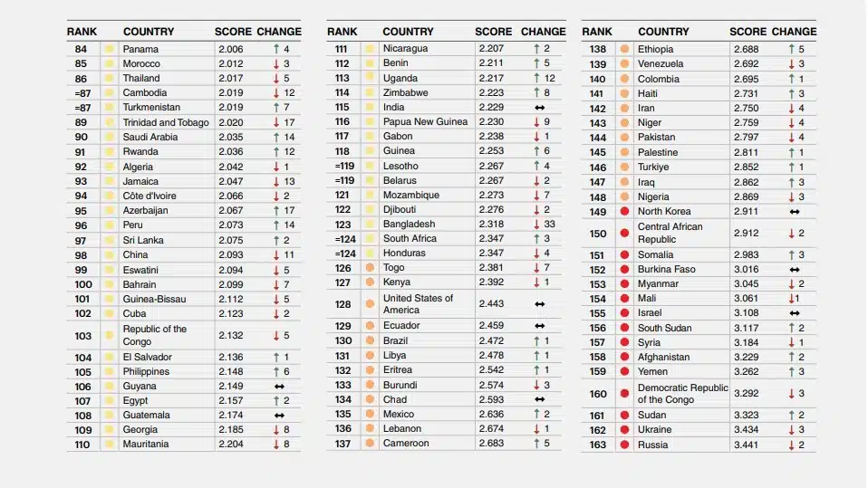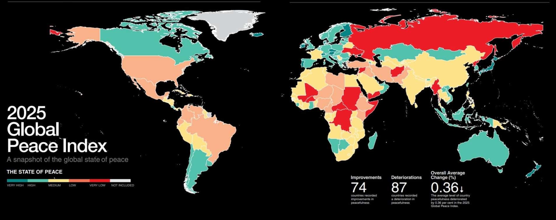 Әлемнің 2025 жылға арналған бейбітшілік индексін (GPI) Экономика және бейбітшілік институты (Institute for Economics & Peace, IEP) дайындады. Тізімге 163 ел кірді. Қазақстан бір жылда бес саты көтеріліп, 56-орынға тұрақтады.