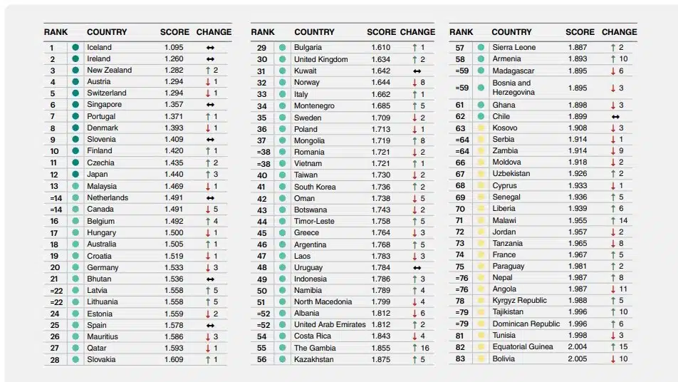 Рейтингте қауіпсіздігі «өте жоғары» 12 ел көрсетілген. Алғашқы үштікке Исландия, Ирландия және Жаңа Зеландия кірді. Австрия мен Швейцария бестіктен орын алды.